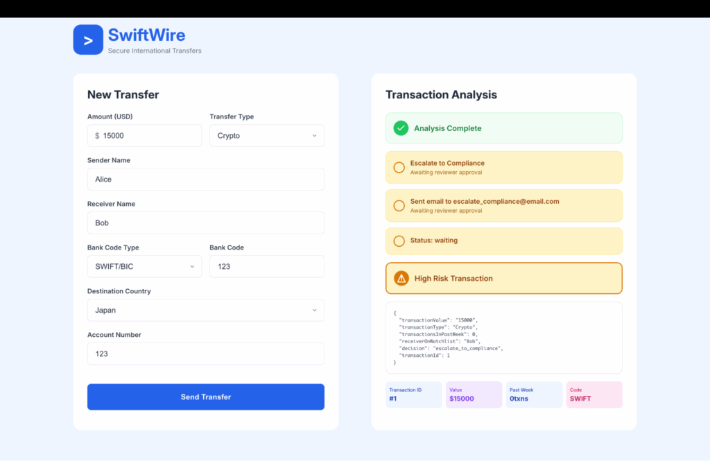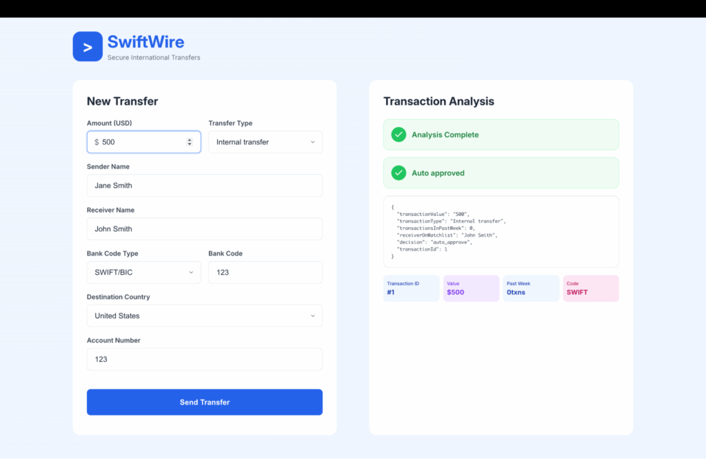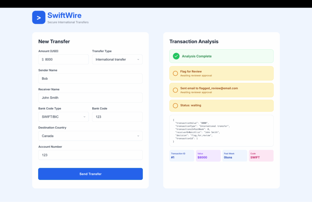 • Inputs: TransactionValue (number), TransactionType (string), TransactionsInPastWeek (number), SenderOnWatchlist (string), HighRiskCountry (string), CustomerProfileMismatch (string)